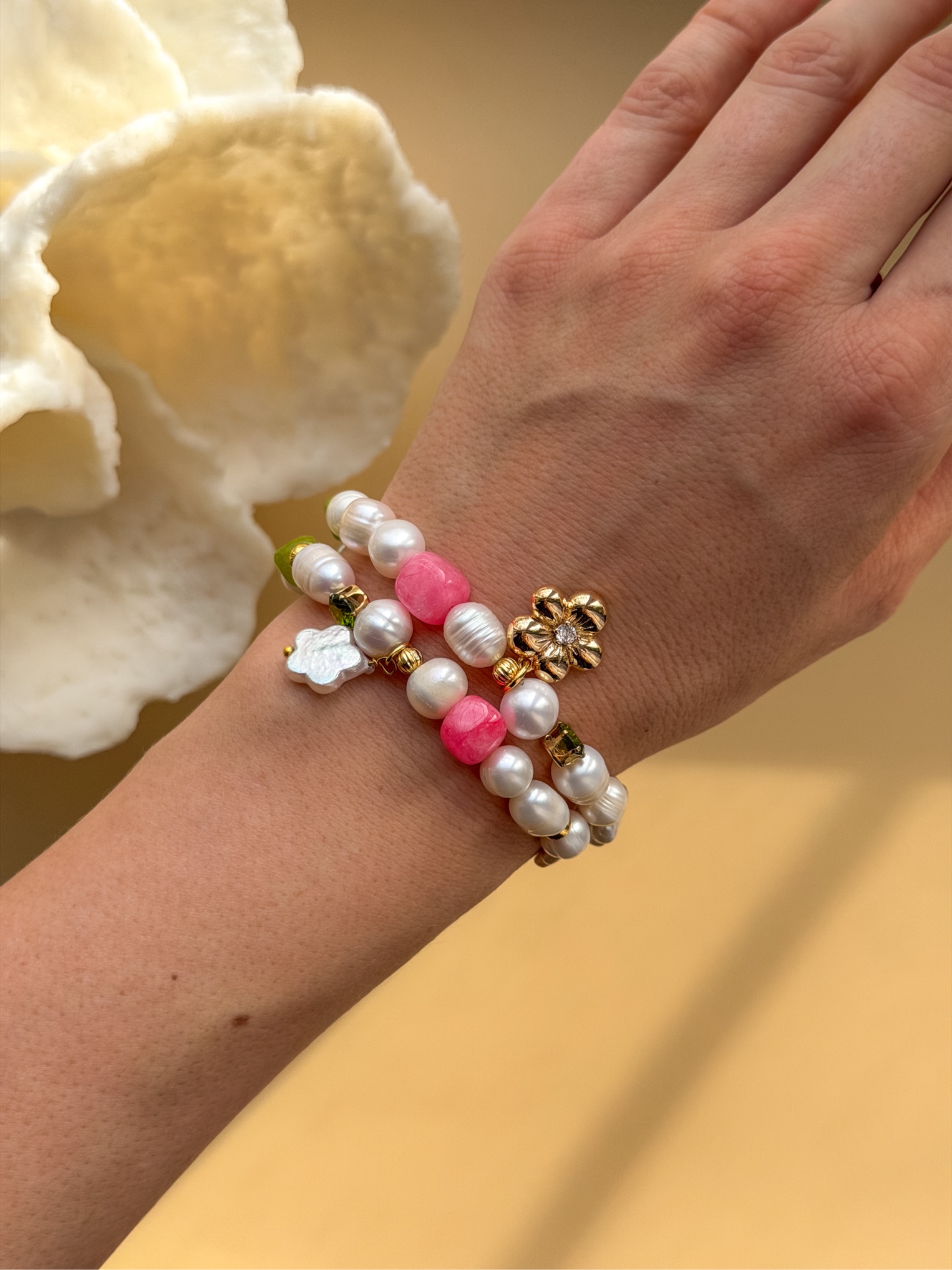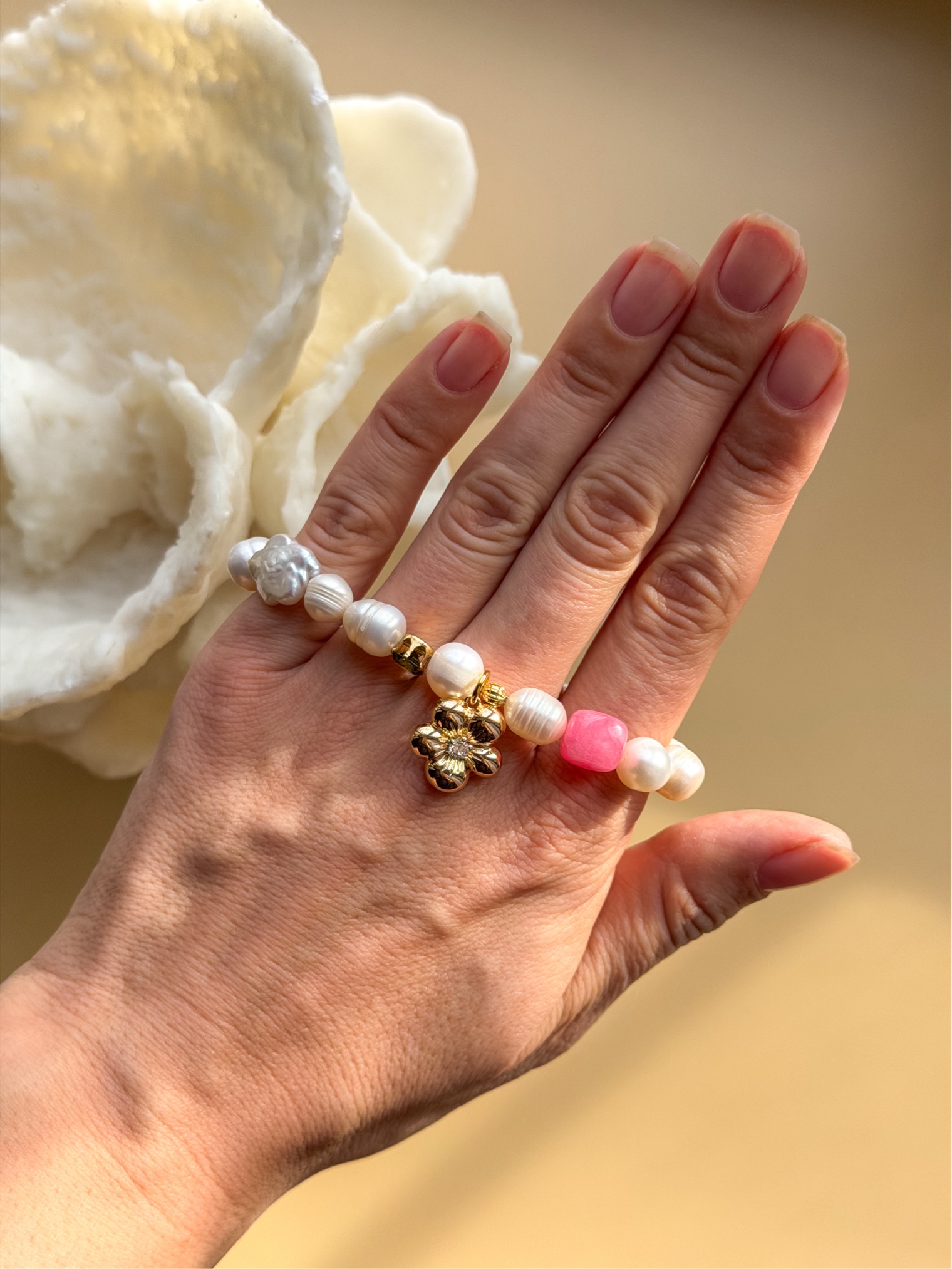 Браслет из микса жемчуга с подвеской цветок