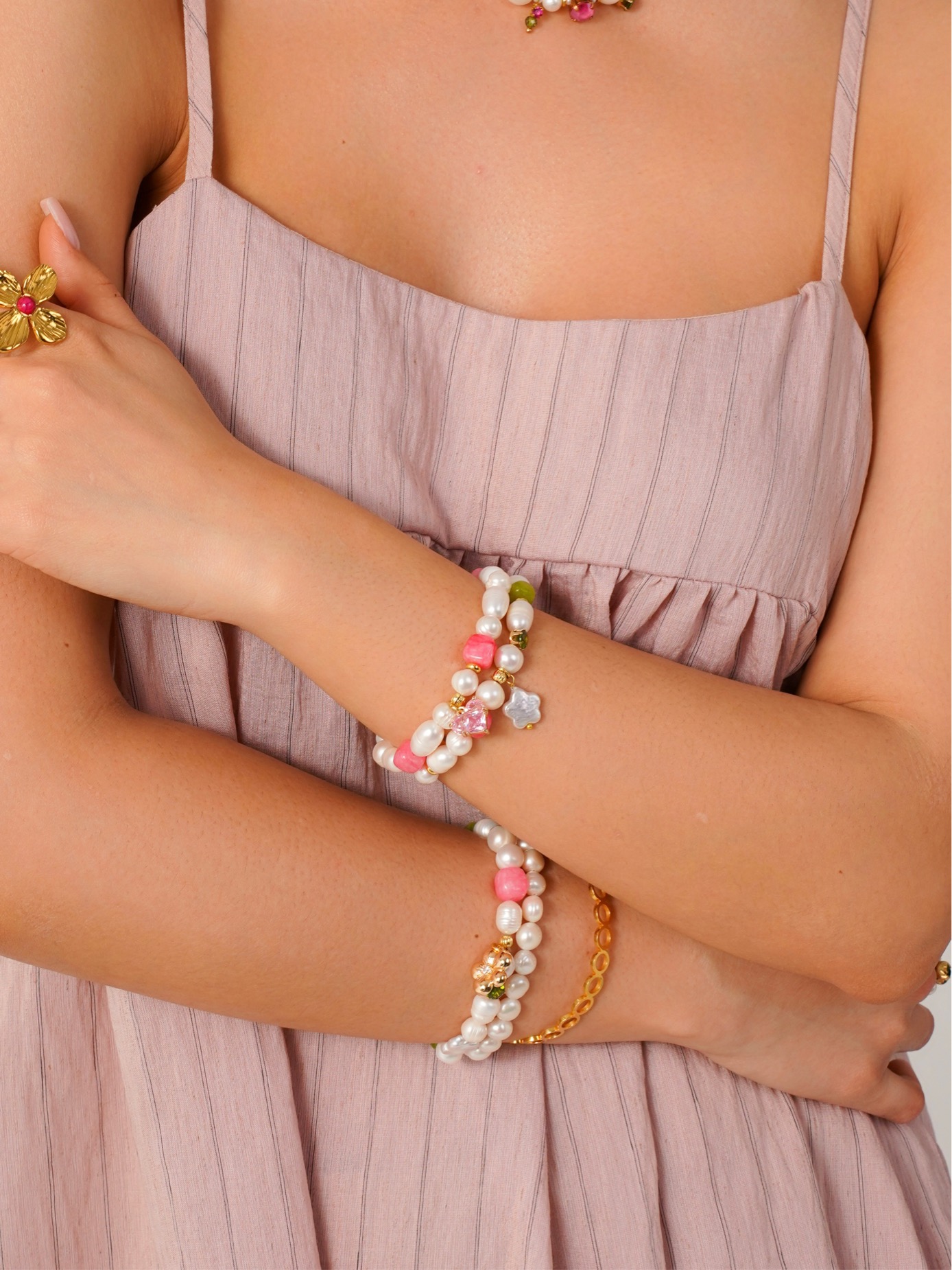 / Браслет из микса жемчуга с подвеской цветок